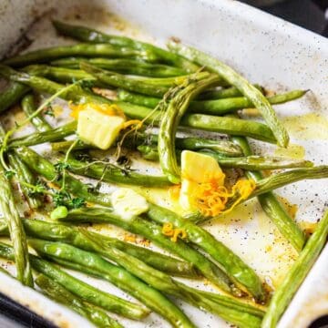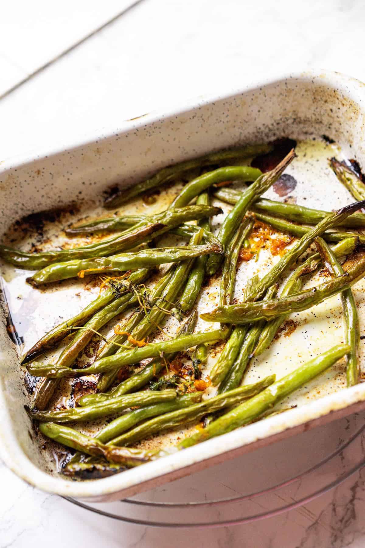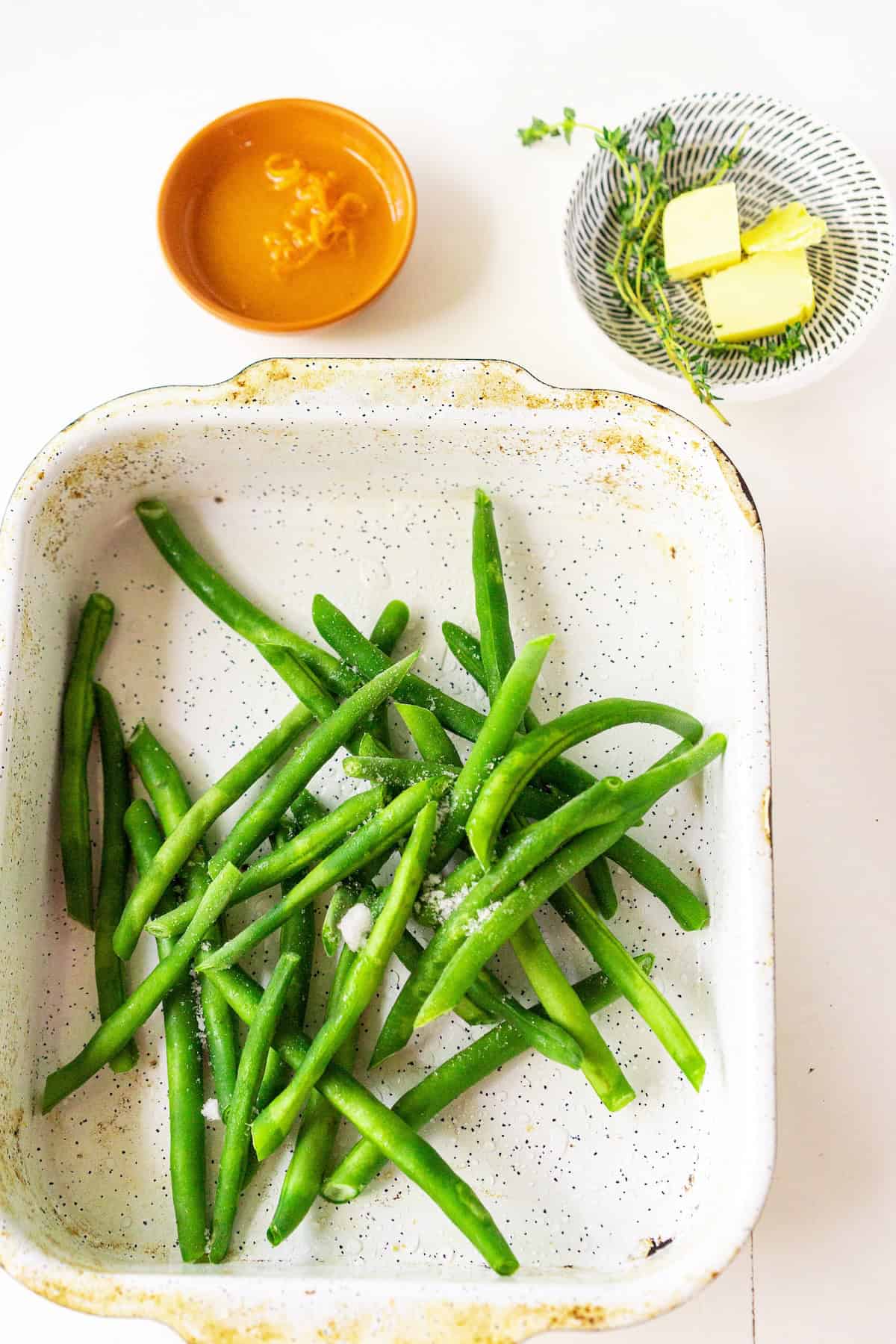 - Leave out the orange, thyme and butter and just roast the green beans plain with olive oil and salt.