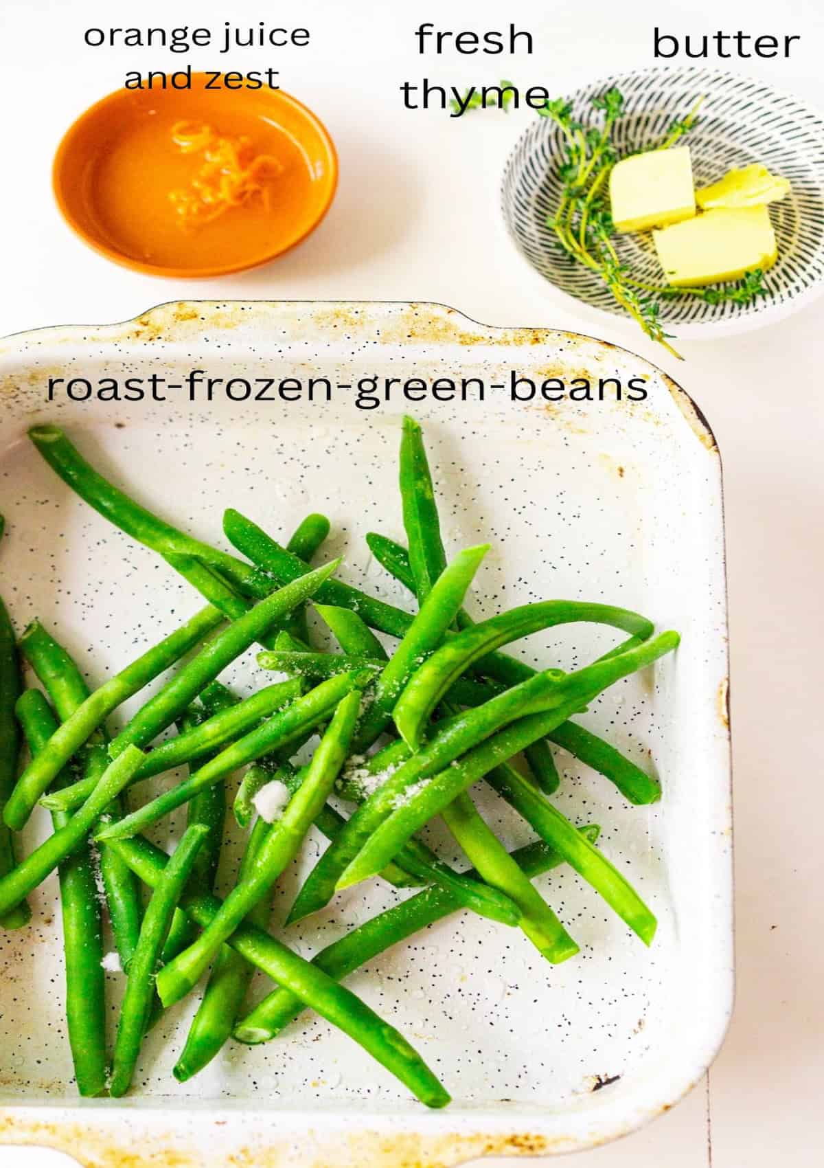 The ingredients for this roast frozen green beans recipe are sweet and simple: