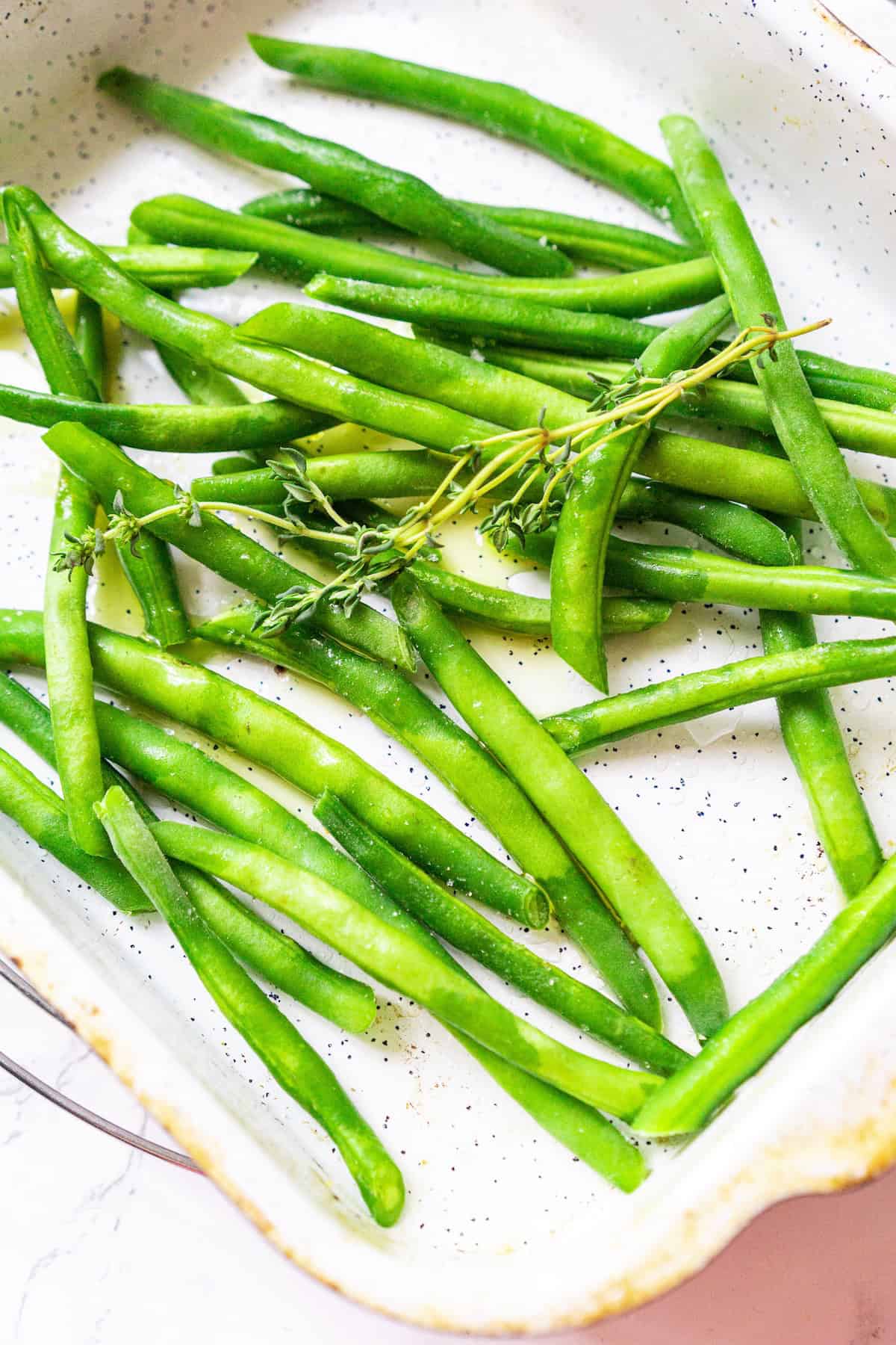 2. Add the green beans with olive oil, salt, spices and herbs to a roasting pan. Coat well and roast the beans for 15 minutes.